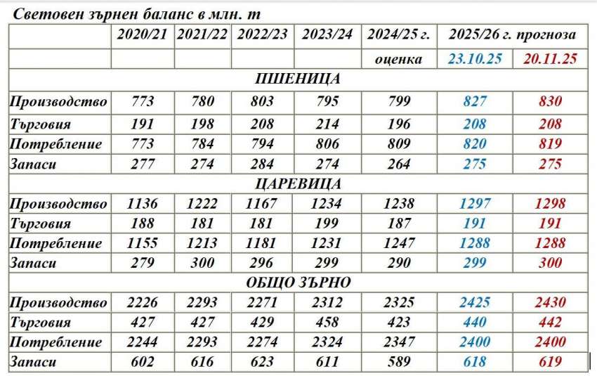 В ноемврийския доклад прогнозата за потреблението на пшеница през 2025/26 маркетингова година е намалена от 819,6 млн.т до 819,3 млн.т, само с 10,8 млн.т повече в сравнение с 2024/25 г. при положение, че при производството се очаква ръст с 30 млн. т (830,4 млн.т). Изоставащото развитие на потреблението води до логичното увеличение с 11,1 млн.т на размера на преходните запаси от пшеница в света в края на 2025/26 г. до 275,1 млн.т.