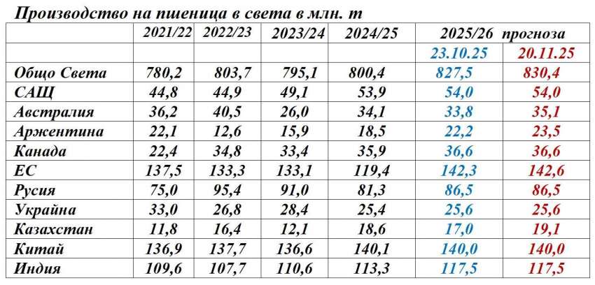 На 14 ноември Министерството на земеделието на САЩ (USDA) увеличи прогнозата на производството на пшеница в света през 2025/26 г. от 816,20 млн.т до рекордните в исторически план 828,89 млн.т. На 20 ноември експертите от Международния съвет по зърното качиха летвата още по-високо, до 830,40 млн.т, ръст с 30 млн.т в сравнение с предходния сезон и с 35,3 млн.т спрямо 2023/14 г.