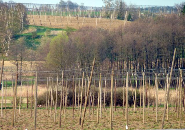 Дървени конструкции за хмел в околностите на Регензбург, Германия.
